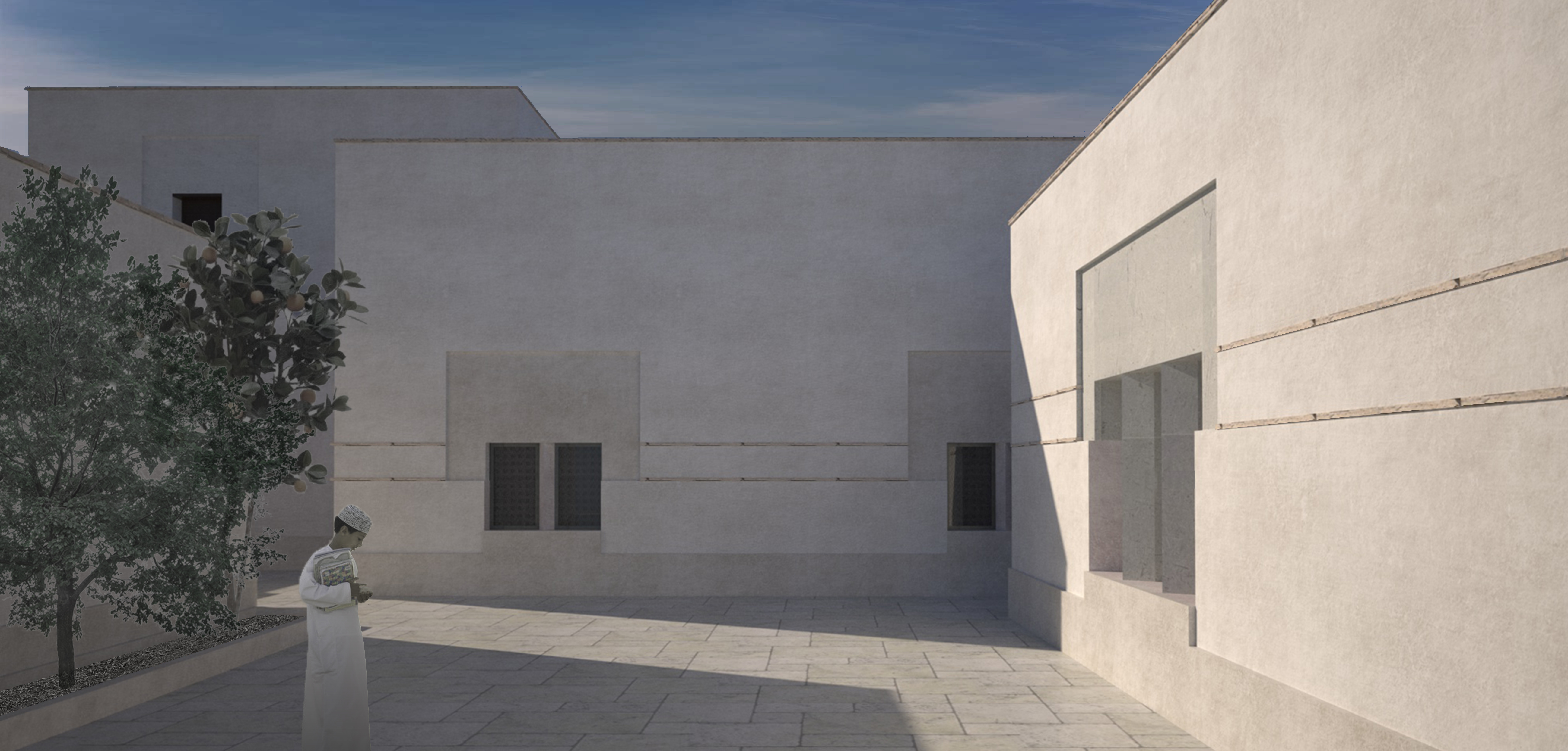 Sightlines are carefully calibrated. Corridors usher visitors comfortably inwards. A heavy wooden door closes with certainty. At the heart of the complex is the majlis, a slender attenuated room, indirectly lit. One descends into the rooms, feels obliged to sit and gaze upwards. The feeling of arrival.