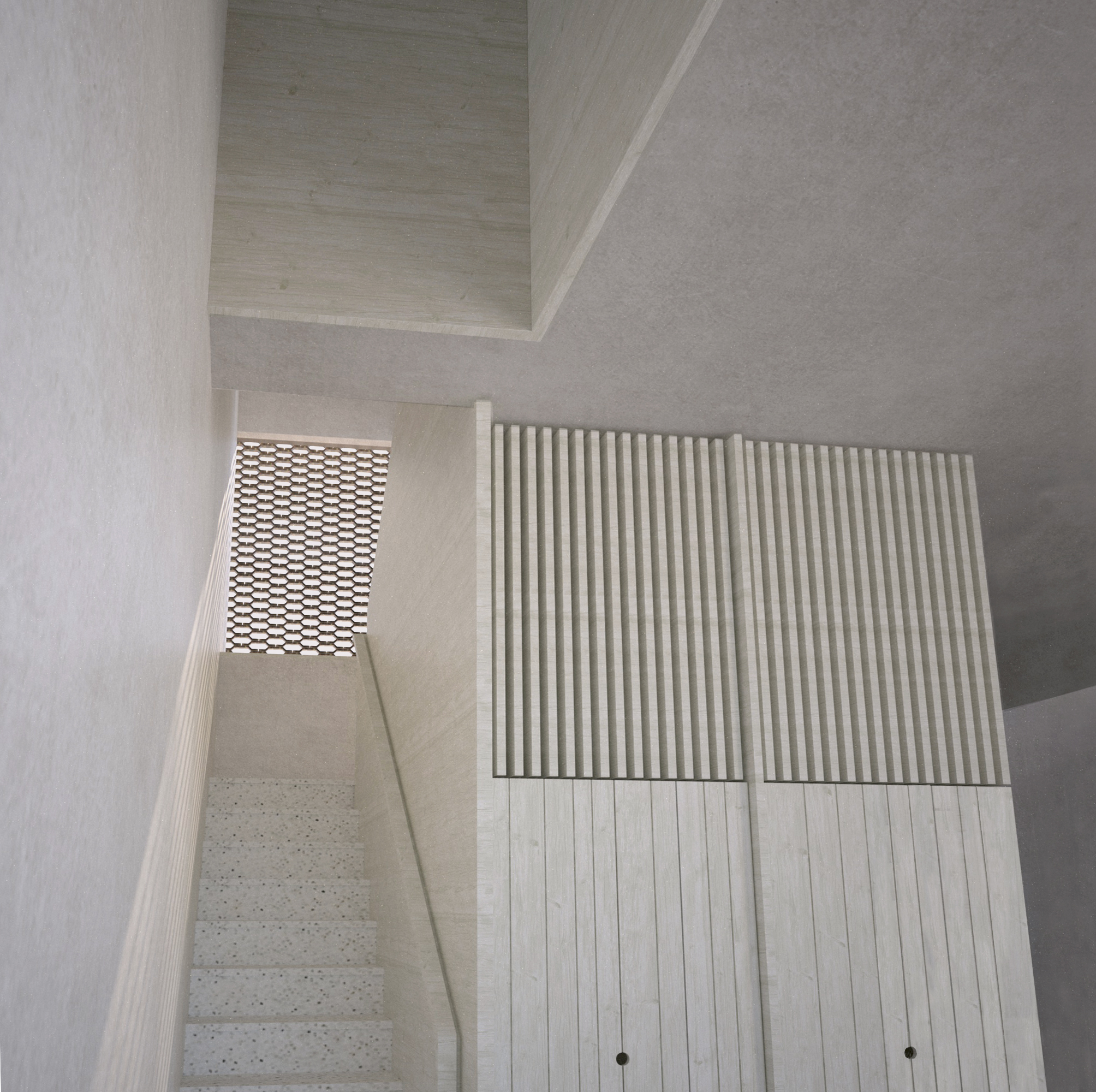 The house is organized around three lightwells which illuminate the interior. Each lightwell is screened from the exterior allowing large format glazing which are both private and shielded from direct sunlight. The lightwells extend through multiple levels creating an architecture of tall communal spaces interconnected in light.